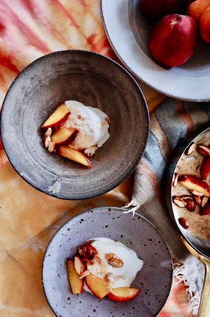 En ljuvlig sommardessert med varma persikor, knapriga mandlar och söt persikobalsamico – serverad med kall vaniljglass för perfekt balans. 4 personer