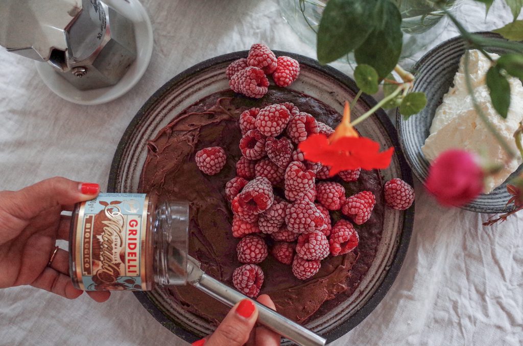 En saftig italiensk chokladkaka med olivolja och hasselnötskräm – serveras med mascarponegrädde och hallon för en ljuvlig avslutning på middagen. 8 personer